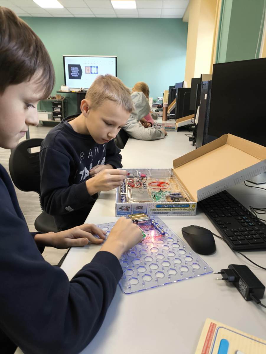Inžinerija, robotika prasideda nuo suvokimo ir mokslo, todėl į renginį įtraukiame ir edukacijas. Šįkart ketvirtokai turėjo du užsiėmimus kartu su STEAM Marijampolė edukatoriais. „Energijos detektyvai“ padėjo suprasti elektros kilmę ir jos kelionę iki lemputės, o veikloje „Susidraugaukime su elektra: įdarbink elektronus!“ vaikai jungė elektros grandines, lemputes, varikliukus ir kurė paprastus robotinius mechanizmus.