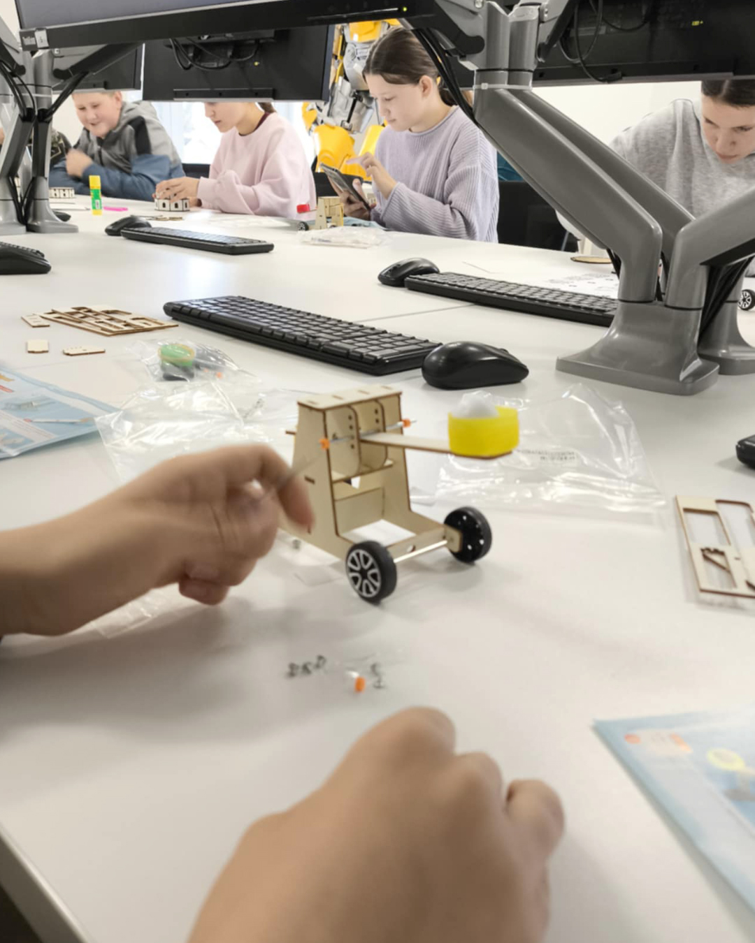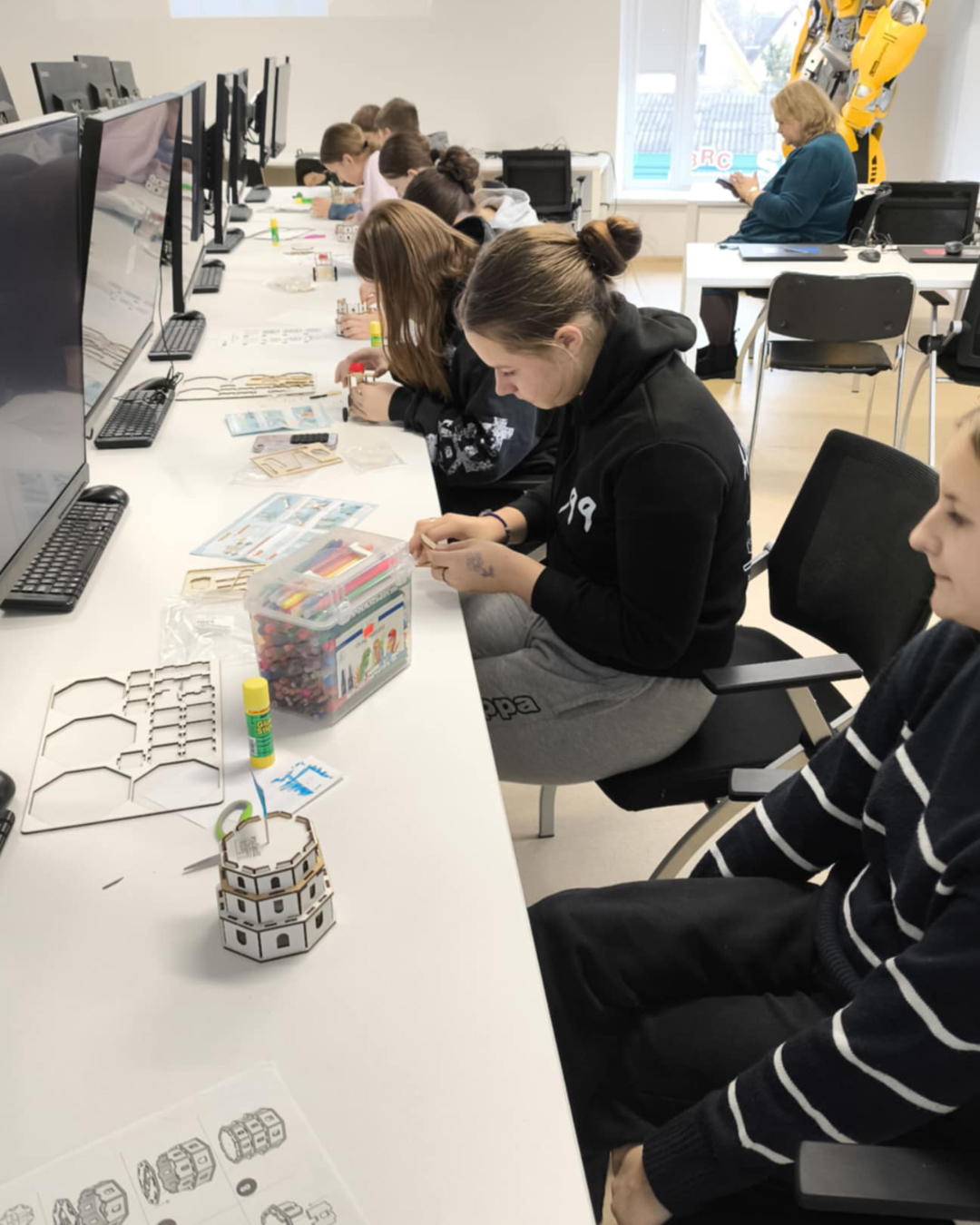 Dirbtuvėse netrūko šurmulio: vieni tarėsi dėl bokšto spalvų ir vėliavos dizaino, kiti eksperimentavo su katapultos konstrukcija, bandė skirtingus variantus, matavo atstumus ir strategavo, kaip pagerinti rezultatą. Taip istorija virto gyvu procesu, kuriame reikėjo ir fantazijos, ir logikos, ir inžinerinio mąstymo.