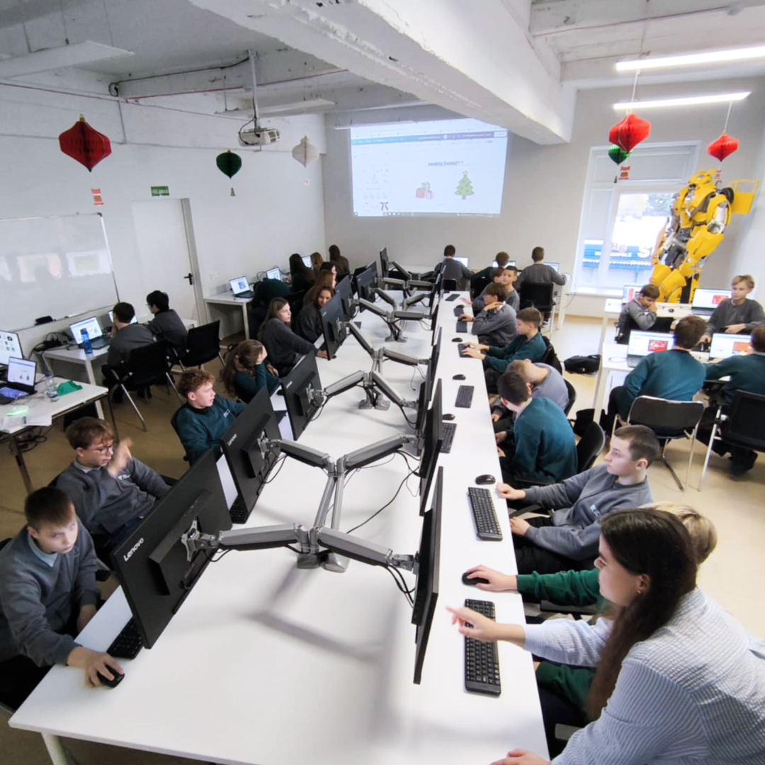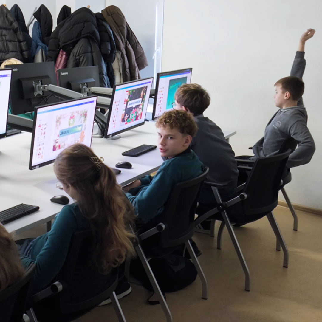 Pirmojo užsiėmimo metu mokiniai kūrė savo kalėdinius sveikinimus naudodami populiarią ir rinkoje plačiai taikomą dizaino programą „Canva“. Dirbdami su šablonais, spalvomis, šriftais ir kompozicija, jie žengė pirmuosius žingsnius į grafinio dizaino ir vizualinio pasakojimo pasaulį. Taip iškart parodoma labai aiški mokymų nauda – tai ne teorija, o praktiškai pritaikomi įgūdžiai, kuriuos mokiniai gali naudoti tiek mokykloje, tiek asmeniniuose projektuose.