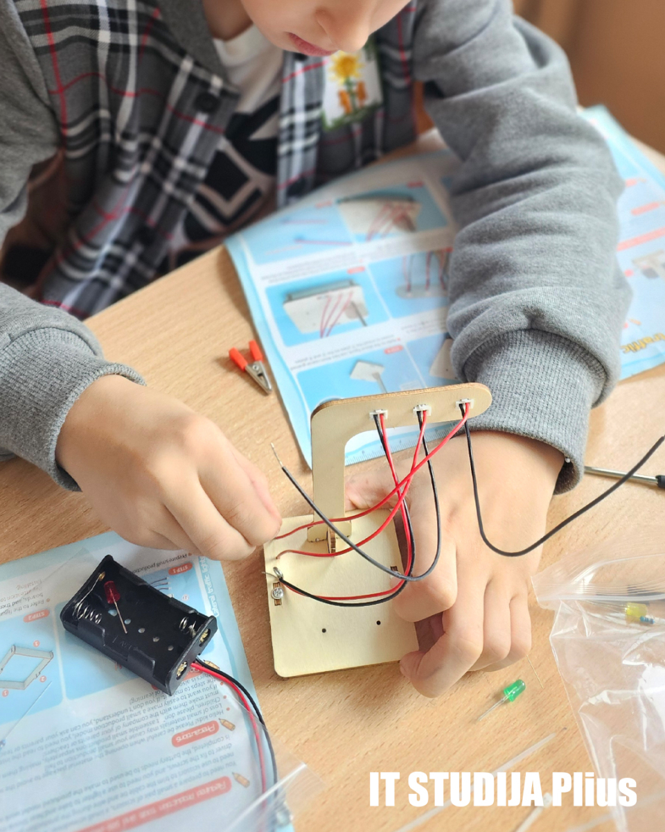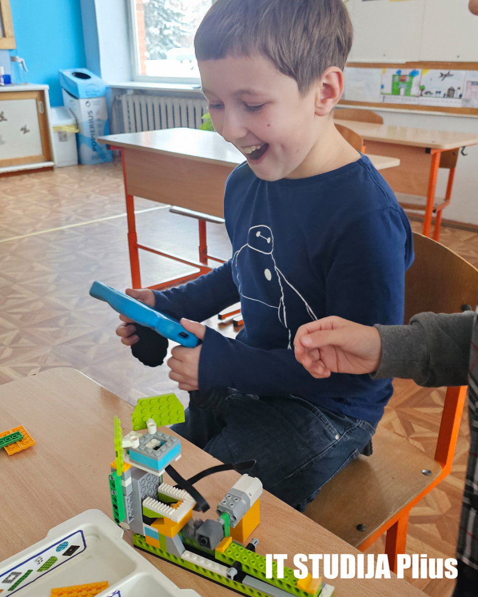 Vienas ryškiausių IT Studija Plius bruožų – teorinės žinios čia neužsibūna „ant lentos“. Vaikai iškart bando, konstruoja, testuoja, stebi. Mikroskopas, matavimo priemonės, LEGO robotika, kūrybinės dirbtuvės, jutikliai, simuliacijos – visa tai tampa įrankiais mąstymui lavinti, o ne tik smagiais žaislais. Kai pirmokai konstruoja saugaus eismo sprendimus ar „svajonių gatvę“, jie mokosi planuoti, tartis ir argumentuoti. Kai antrokai atlieka eksperimentus, kuria robotų mechanizmus ar tyrinėja papildytą realybę, jie mokosi nebijoti bandymų ir klaidų – nes klaida čia yra kelio dalis.