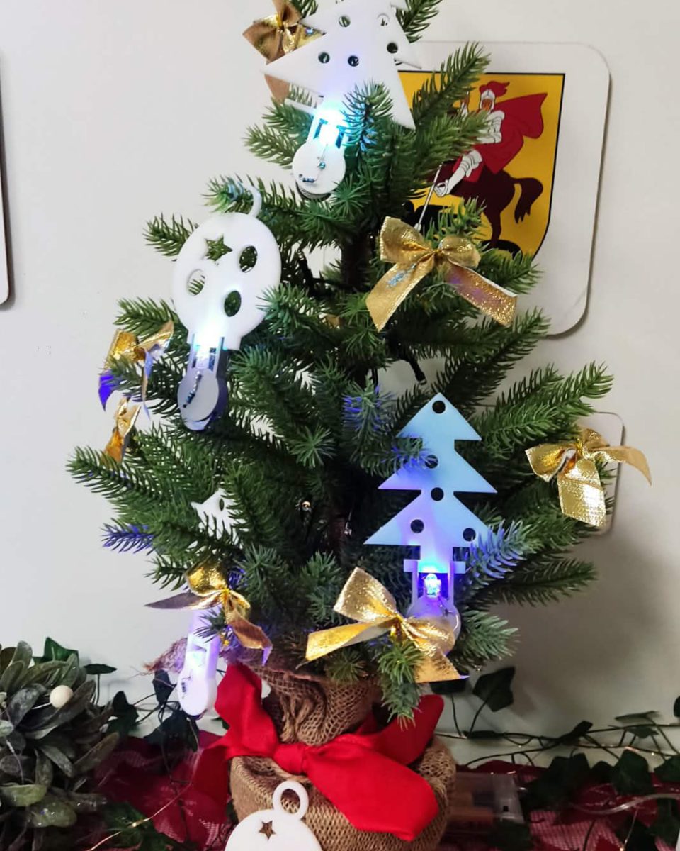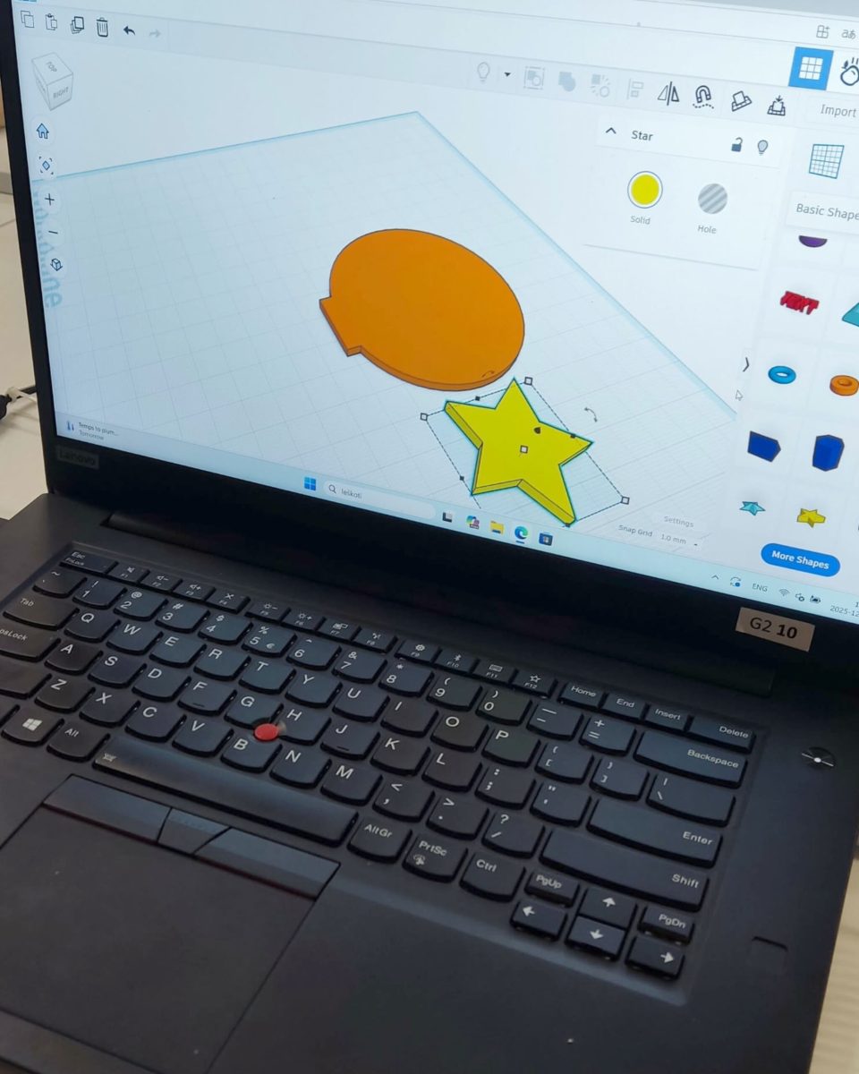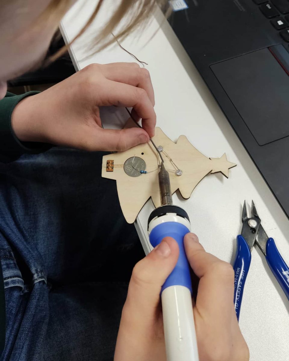Lygiagrečiai vaikai gilino 3D modeliavimo įgūdžius su „TinkerCAD“ ir kūrė objektus, kuriuos galėjo atsispausdinti bei parsinešti namo. Helovino laikotarpiu gimė šviečiančios dekoracijos – nuo karstų iki moliūgų, kur dizainas susitinka su elektronika ir litavimu. Vienu rimčiausių išbandymų tapo LED kubai, kuriuose 3D modeliavimas reikalavo tikslumo, o kiekviena kubo pusė turėjo savo „galvosūkį“ – nuo pikselių meno iki sudėtingų formų ir net elektros grandinės brėžinio logikos. Kalėdiniuose darbuose atsirado dar daugiau elektronikos: šviečiančios eglutės ar skambaliukai, kuriuose mokiniai integravo komponentus, skaičiavo veikimo laiką, naudojo rezistorius, mygtukus, mokėsi valdyti LCD ekranus ir servo variklius.