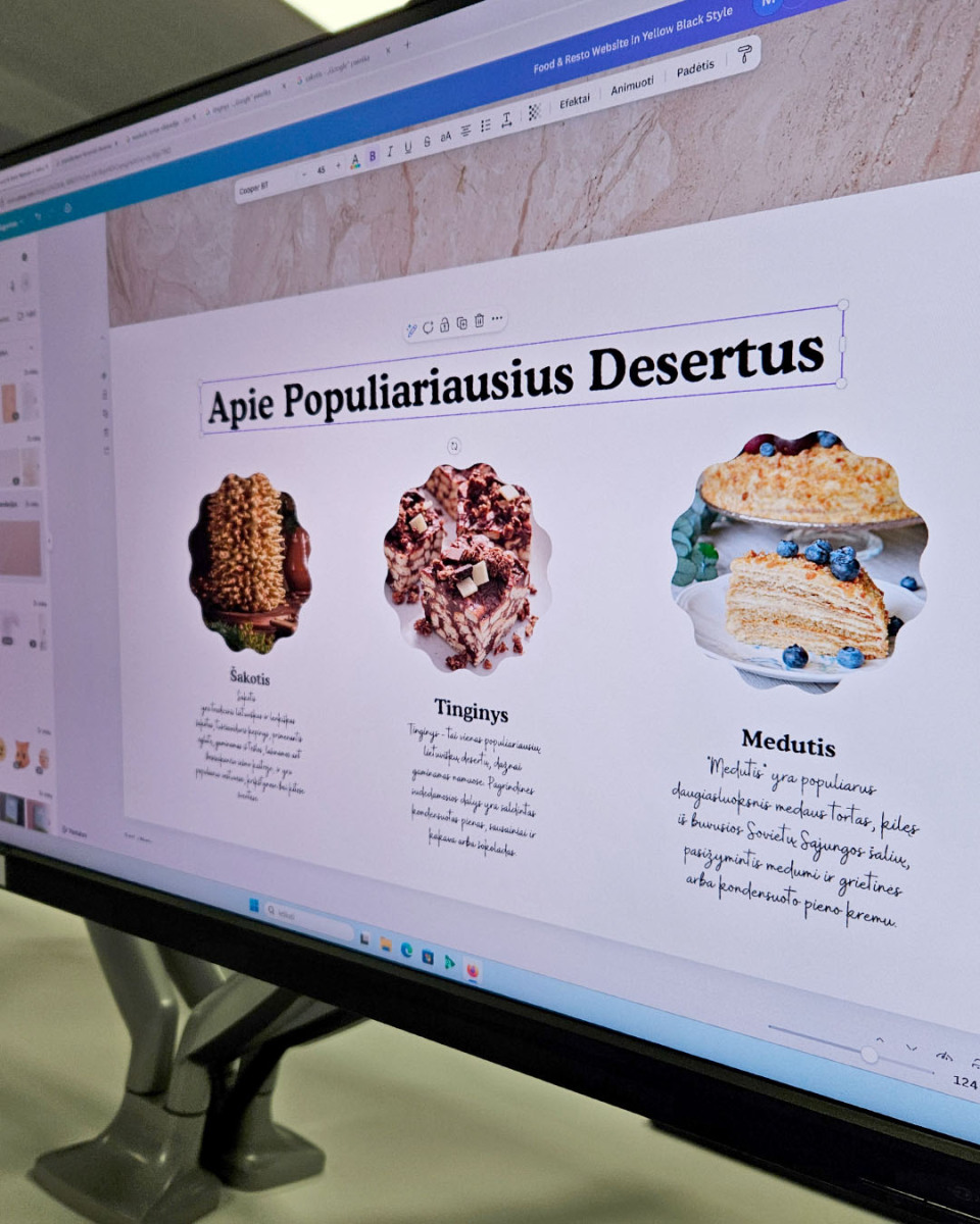Svarbia mokymų dalimi tapo pažintis su dirbtinio intelekto galimybėmis „Canva“ aplinkoje. Mokiniai išbandė, kaip AI gali padėti greičiau generuoti idėjas, kurti tekstus, vizualus ar vaizdo fragmentus, kartu mokydamiesi vertinti, kada technologija padeda, o kada sprendimą svarbu priimti pačiam.
