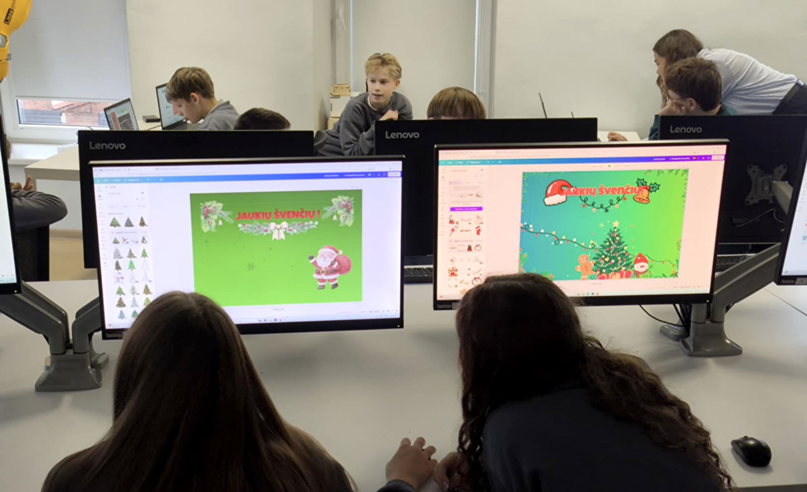 Toliau sekė darbas su „Canva“ programa, kurio metu mokiniai mokėsi savarankiškai orientuotis darbo aplinkoje, kurti vizualus pagal aiškias užduotis ir tinkamai juos išeksportuoti. Pamokų metu vaikai kūrė atvirukus, pristatymo skaidres, animuotus dizainus, išbandė šablonų kūrimą ir pritaikymą skirtingiems projektams. Vėliau prie šių įgūdžių prisijungė animacijos pagrindai ir vaizdo įrašų montavimas, dirbant su laiko juosta, perėjimais, judesio efektais ir garsu.